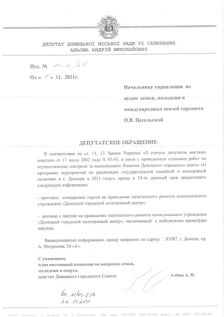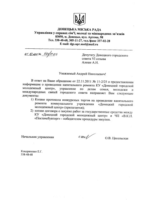 Месяц назад завершился капитальный ремонт Донецкого городского молодежного центра. Соответствующей программой на эти цели было предусмотрено более 2,5 млн. грн. донецких налогоплательщиков, которые успешно освоены. Но насколько эффективно, нам еще предстоит убедиться и посвятить в это дончан. На посланный в Управление по делам семьи, молодежи и международных связей Донецкого горсовета депутатский запрос, нам ответили без промедления. На сегодня мы располагаем всеми необходимыми документами (договор, сметы, акты выполненных работ), чтобы проанализировать эффективность расходования бюджетных средств.