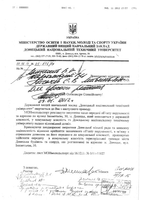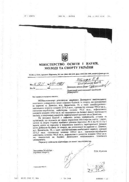 Наконец, в декабре наши усилия дали первые плоды: Минобразования разрешило новому балансодержателю – ДонНТУ – передать здания и сооружения по Бахметьева,30 Донецку.